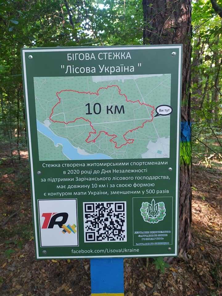 Стежку довжиною майже в 10 км зробили територією Зарічанського лісу під Житомиром у 2020 році до Дня Незалежності. Над проєктом працювали бігуни з TopRunners Zhytomyr.