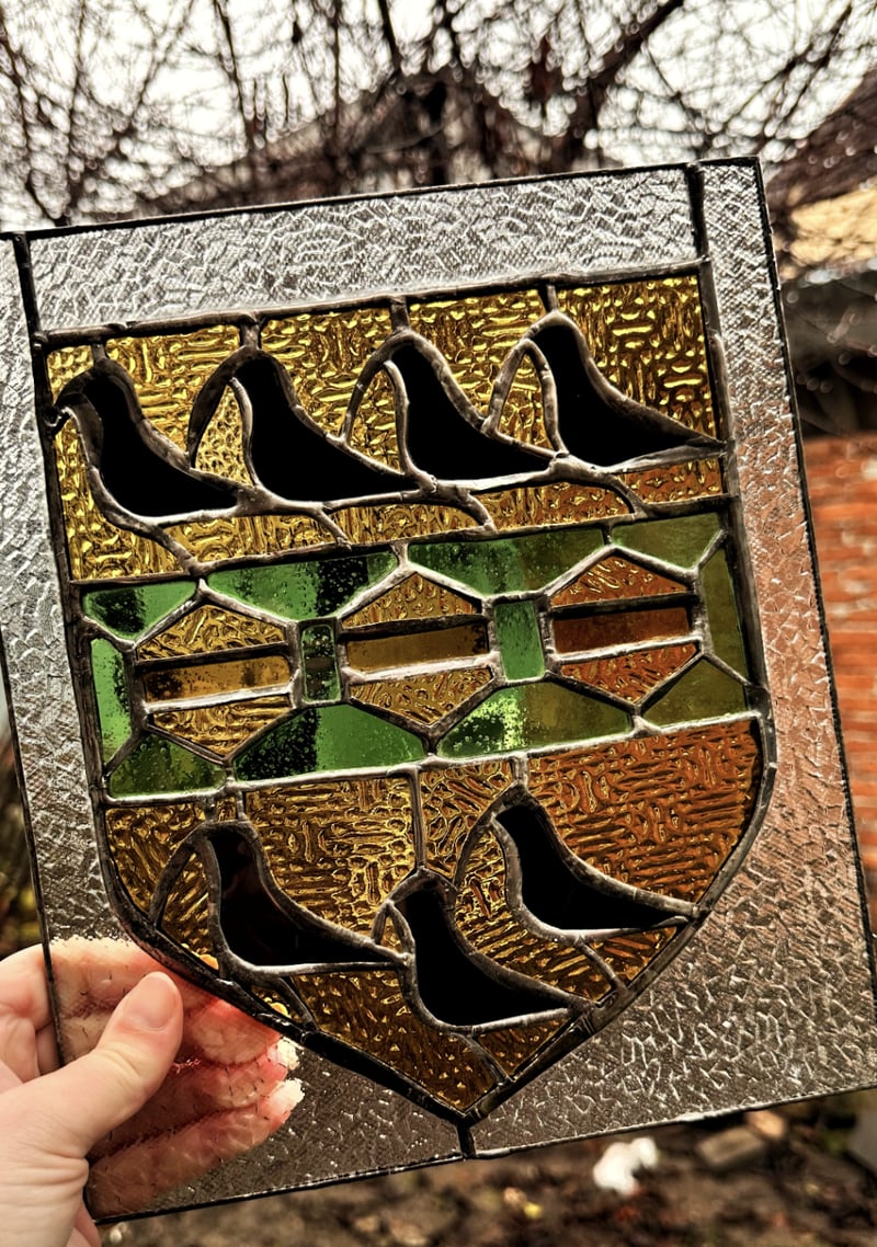 Василь: Також ми виробляємо вітражі. Наприклад, герб графів Другетів, що правили в Ужгородському замку понад 300 років. Це справжній експеримент, адже тут скло різної товщини: птахи з товстого пляшкового скла, яке зазвичай використовують для ігристого, тонке зелене з пивних пляшок і рельєфні елементи зі старих вікон. Це єдиний експонат, який ми передали у фонд замку.