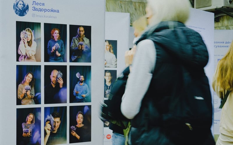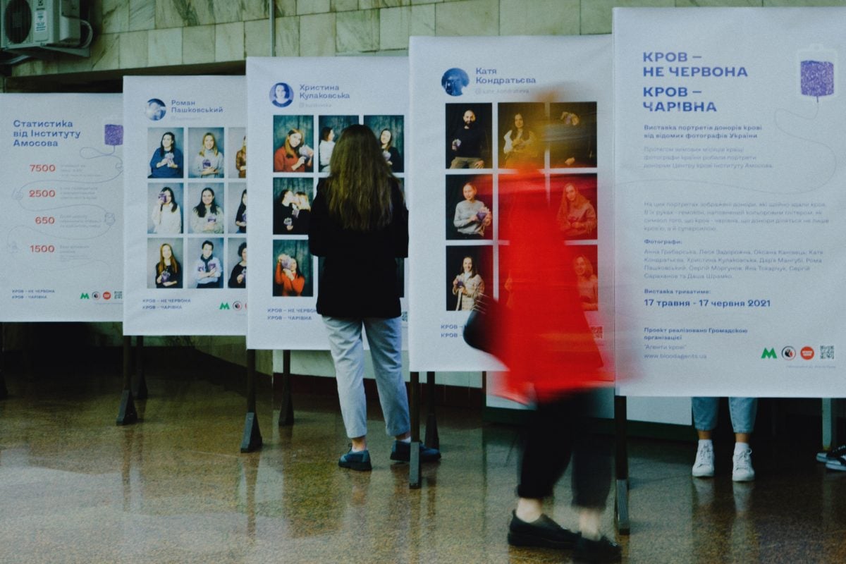 У Київському метро на станції Театральна відкрили виставку портретів донорів крові, які всю зиму здавали кров в Інституті Амосова в рамках проєкту «Кров чарівна».
