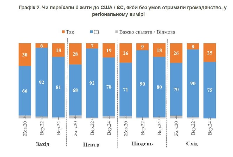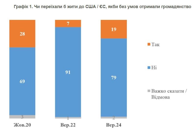 Пік бажання українців емігрувати спостерігався у 2020 році — тоді 28% опитаних висловлювали бажання покинути країну, тоді як 69% респондентів планували залишатися в Україні. Після початку війни цей показник значно зменшився.