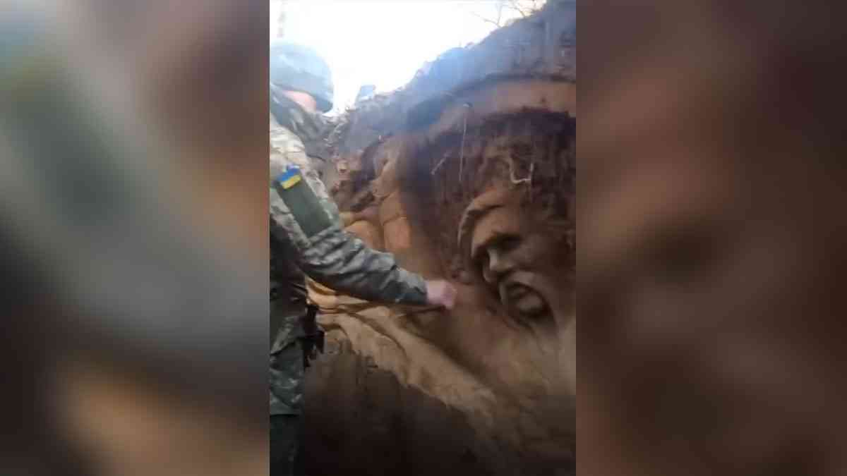 На ролику видно, що військовий повирізав в окопі реалістичний портрет козака, а поряд із ним — символ добра.