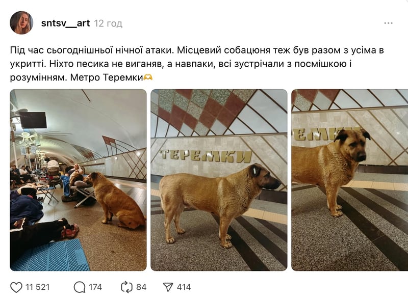 Першою про вуличного собаку, який ховався від атаки на київській станції метро Теремки, опублікувала користувачка Threads.