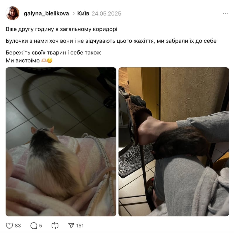 Пані Галина вже не вперше ділиться, як ховається під час тривоги зі своїми тваринками. Так вони сиділи в укритті під час масованого ракетного обстрілу в Києві в травні: