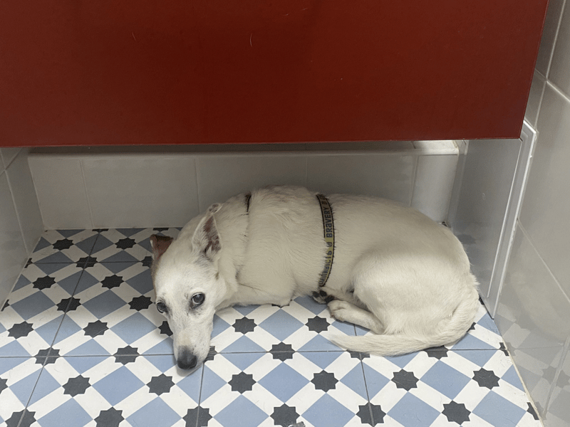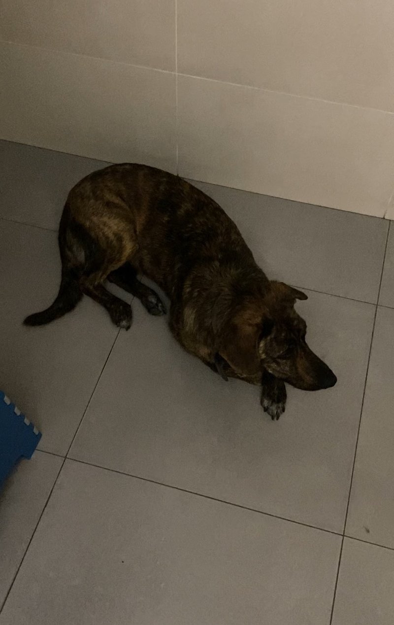 «Це наш місцевий песик. Він ночує в метро, навіть коли не має тривоги. Ми постійно його пускаємо разом із нами, коли йдемо на ночівлю. Працівниці його годують коли всі вагони з людьми розʼїдуться. Ніколи навіть не було питання чи думки про те, щоби вигнати його. Він чемно чекає до ранку і виходить разом з усіма. Іноді з ним ще одна дівчинка заходить — сіра собачка»