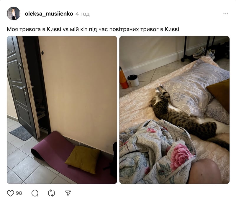 У ніч із 3 на 4 липня росія здійснила одну з наймасштабніших дроново-ракетних атак на Київщину, Дніпропетровщину, Сумщину, Харківщину, Чернігівщину. Поки сили ППО рятували міста від балістики, «Шахедів» і «Кинджалів», українці рятувалися з тих, кого люблять, в укриттях — у метро, ванній, коридорі. На ранок соцмережі почали наповнюватися світлини, як люди переживали російський обстріл разом зі своїми (й не лише) пухнастиками.
