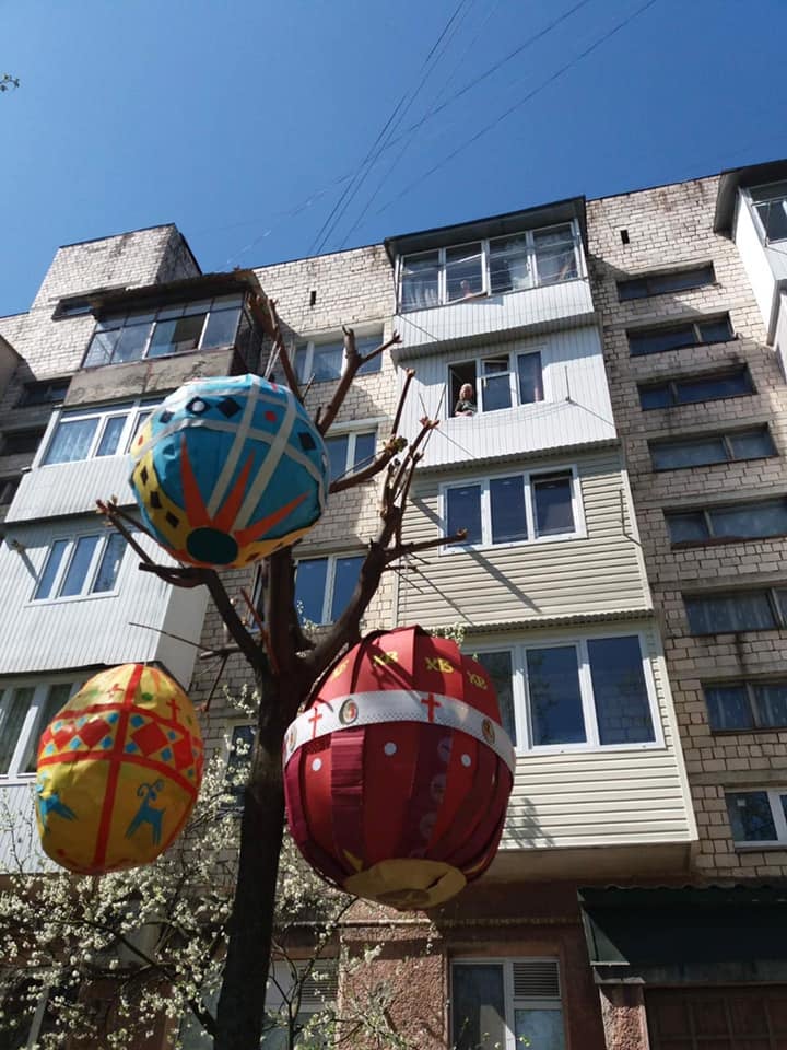У Чернівцях у дворі багатоповерхівки на вулиці Героїв Майдану місцевий мешканець розвісив величезні писанки.