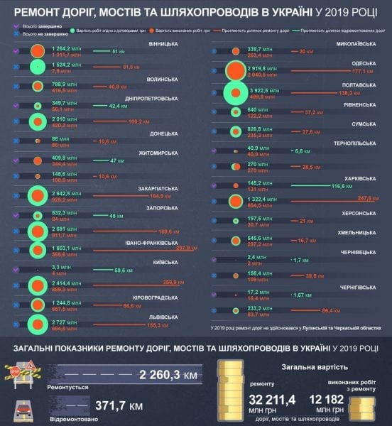 “В Україні завершується сезон ремонту дорожньої інфраструктури. За рік було зроблено 371,7 км доріг, мостів і шляхопроводів, всього ремонтується понад 2,2 тисячі км”, – ідеться у повідомленні.