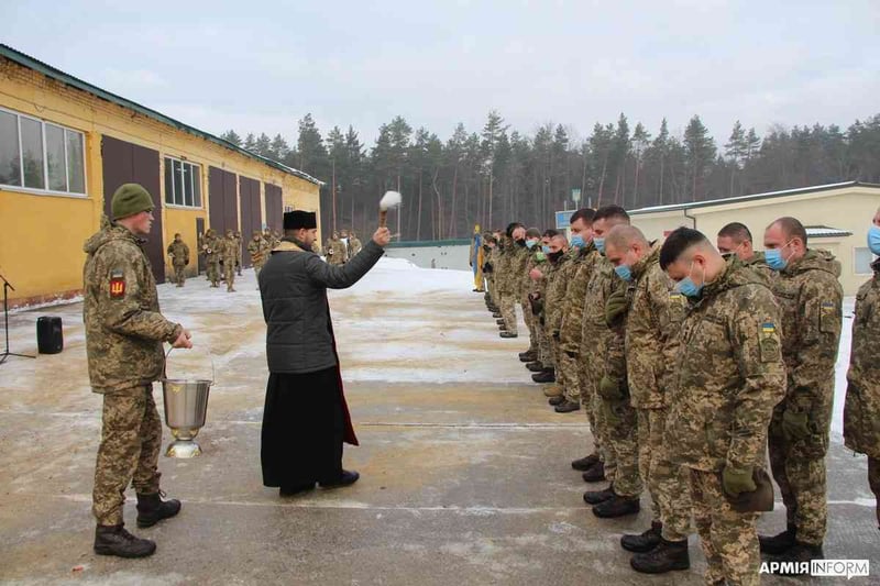 Після перерізання символічної стрічки військовий капелан частини отець Тарас благословив і окропив свяченою водою особовий склад школи та її навчально-матеріальну базу.