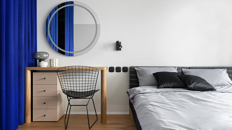 Для зонування використали яскраво-сині штори зі щільного матеріалу.