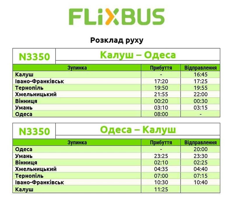 Назад з Одеси відправлення о 20:00, до Тернополя автобус прибуває о 7 ранку, до Франківська – о 10:30, до Калуша – об 11:25″, – розповіли у FlixBus.