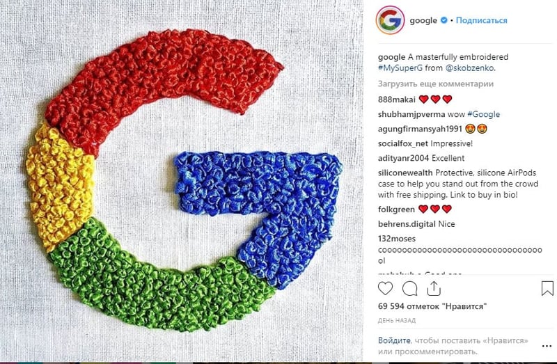 Новим авартаром офіційного Instagram-акаунту Google стала робота української майстрині з Кривого Рогу, 65-річної Людмили Кисельової. Жінка зобразила лого Google у вишивці в стилі “французький вузлик”. Наразі це фото вже зібрало понад 68 000 лайків.