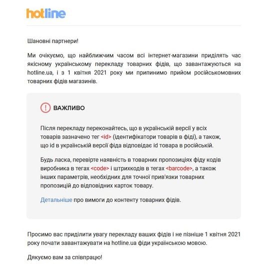 «Тепер hotline прийматиме лише українські описи в цих фідах.Тобто всі інтернет-магазини, які захочуть розміщувати там свої товари, апріорі будуть змушені зробити повноцінні українські версії своїх магазинів, а не на відчепись, бо саме їх доведеться експортувати для hotline», – йдеться у повідомленні.