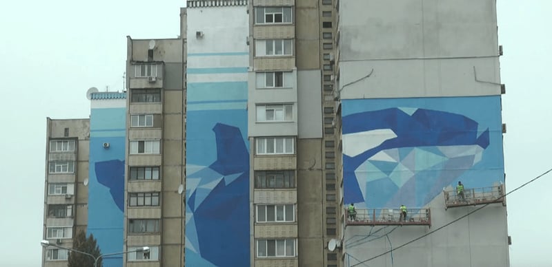 Панно намалювали на трьох стінах 16-поверхового будинку, на ньому зображені п’ять маленьких китів і один великий (косатка).