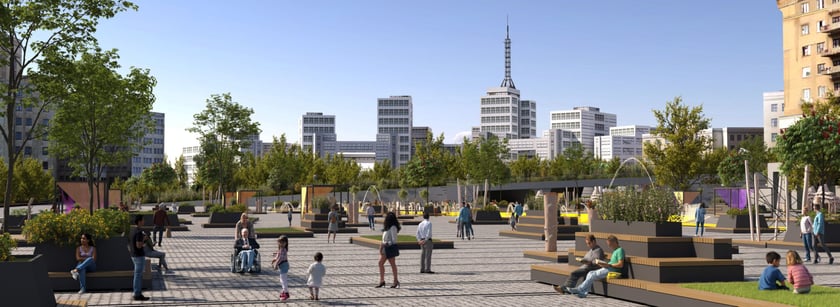 Проєкт базується на модульних рішеннях, які дозволяють змінювати функції площі відповідно до потреб мешканців. Інтеграція зеленої зони зробить площу продовженням парку Шевченка, створивши єдину екосистему.