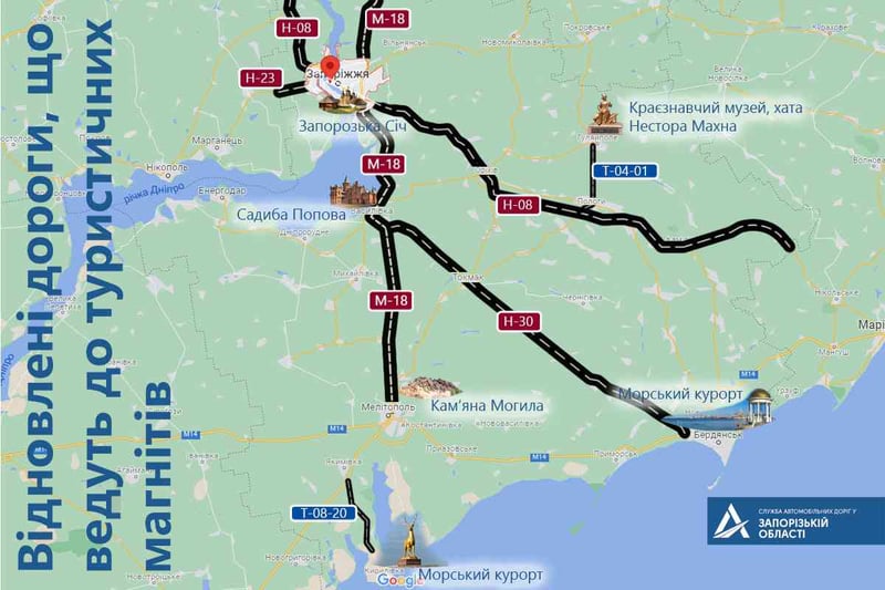 Деякі відновлені дороги ведуть до архітектурних та історичних пам’яток, а також до курортів Азовського узбережжя.