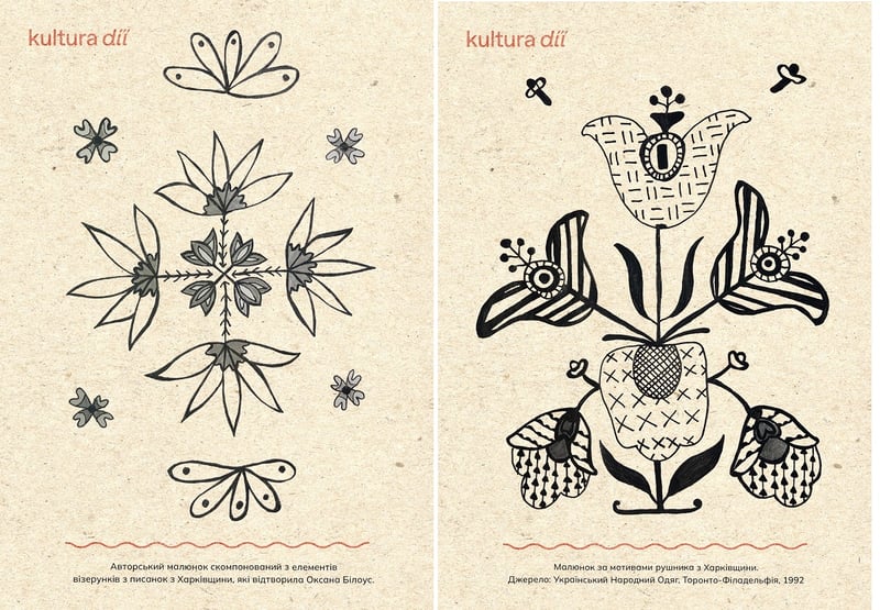 Благодійний фонд «Культура дії» започаткував ініціативу з дослідженням традиційних орнаментів різних регіонів України, і розпочав з Харківщини. Команда волонтерів та експертів дослідила і відтворила на трьох листівках намальовані елементи: наріжника, рушника та писанки.