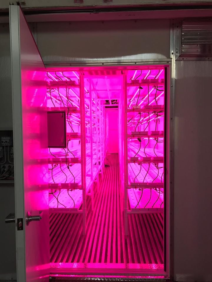 Контейнер площею 30 кв. м облаштований всередині вертикальними стійками з полицями. Конструкція обладнана трубами, по яких до рослин надходить вода і поживні речовини. Зелень і трави освітлюються синіми і рожевими світлодіодами, led-лампами.
