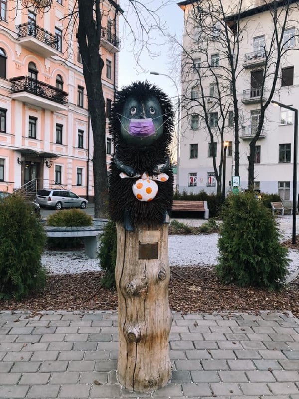 У Києві легендарний їжачок у тумані, що розташований у сквері на вулиці Рейтарській, в знак солідарності з киянами, які живуть в умовах карантину, одягнув на мордочку захисну медичну маску. Хто саме прикрасив скульптуру їжака маскою – невідомо.