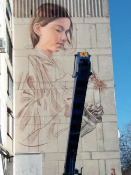 Мурал створив відомий український художник Олександр Корбан, зобразивши дівчинку із квіткою. Корбан – виходець з Донбасу.