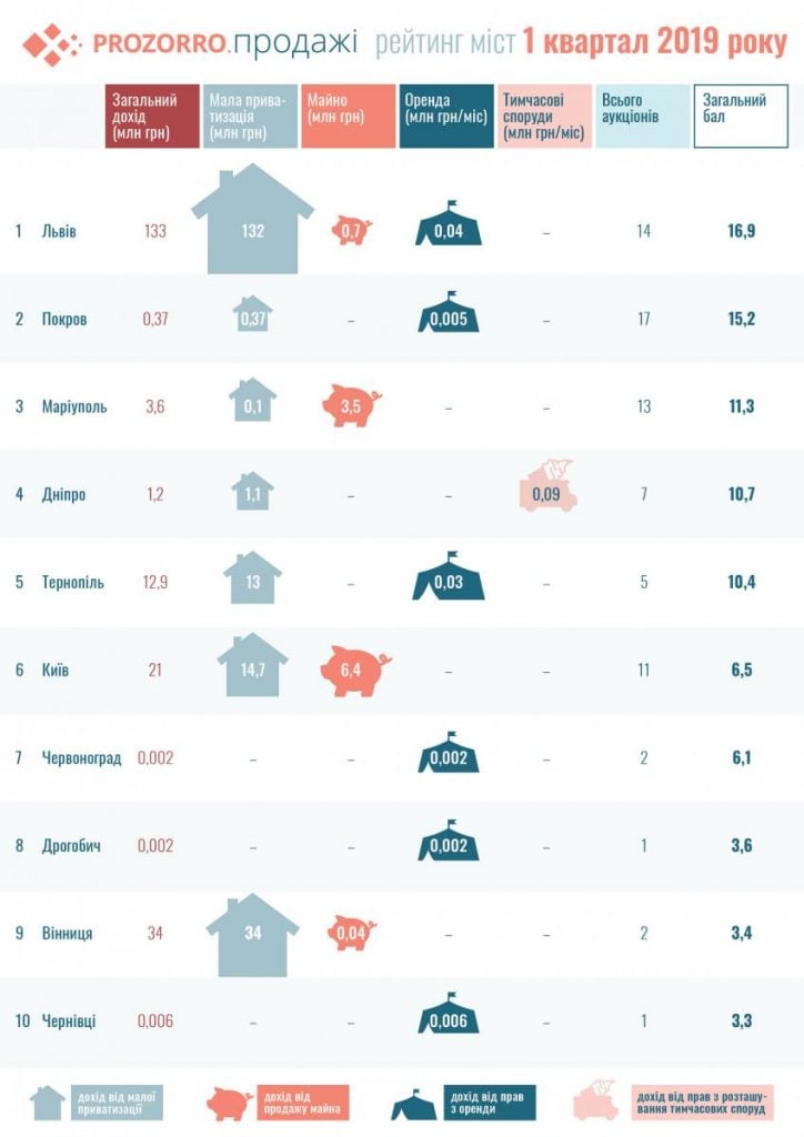 Рейтинг враховував 4 напрямки, за якими муніципалітети працюють в системі ProZorro.Продажі: мала приватизація, оренда нерухомості, продаж майна та оренда тимчасових торгових місць.