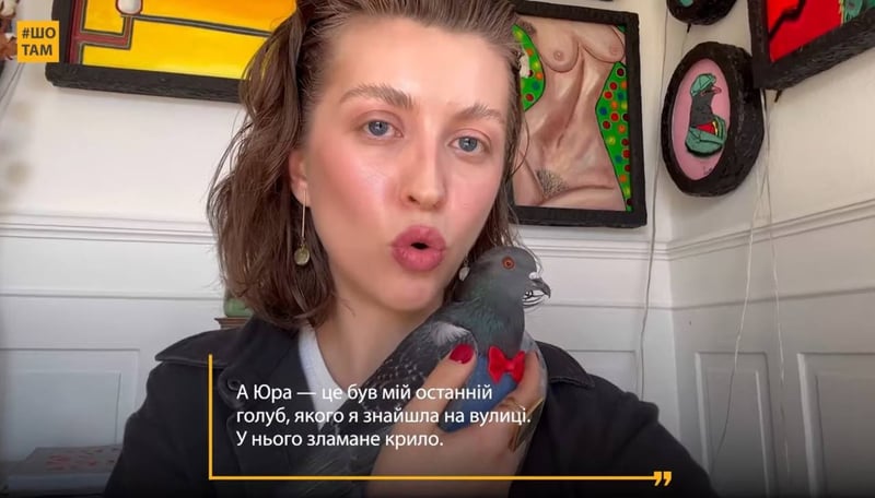 Коли я прийшла туди все зачистити, знайшла у квартирі двоє мертвих пташенят голубів та одного ледве живого. То був Валєра. Я Валєру виростила, вилікувала й відпустила на волю. Але, сумуючи за ним, я почала малювати такі собі жартівливі картини. Ось вони, до речі, позаду мене.