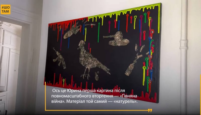 Ось це Юрина перша картина після повномасштабного вторгення – “гівняна війна”. Матеріал той самий – “натурель”.
