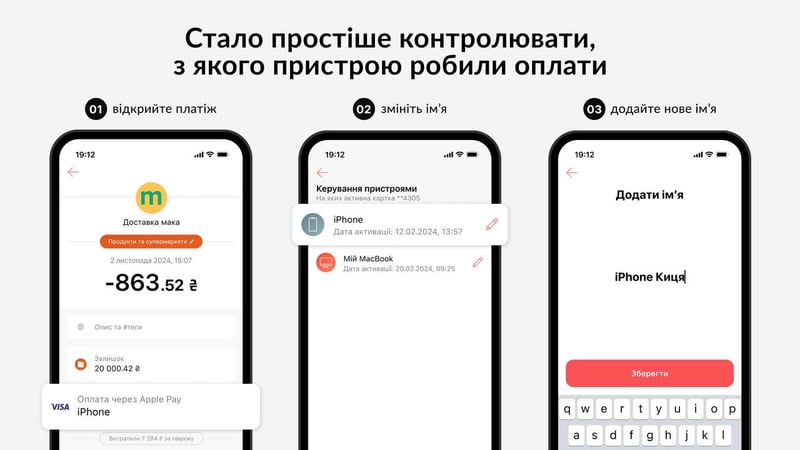 У деталях кожної транзакції буде показано, з якого саме пристрою відбувалася оплата. Це зручно для тих, хто надає доступ до картки іншим особам, адже тепер можна легко відслідковувати, хто та коли використав кошти.