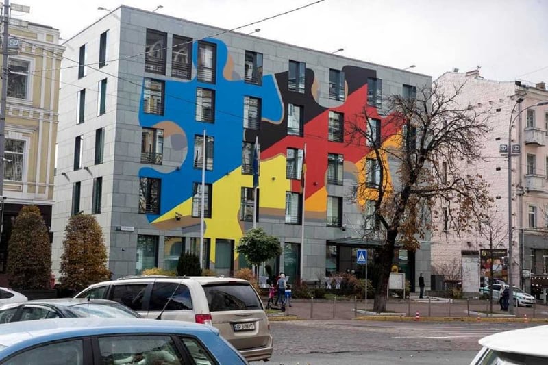 У Києві на будівлі посольства Німеччини презентували художню композицію, виконану в стилі тейп-арт.