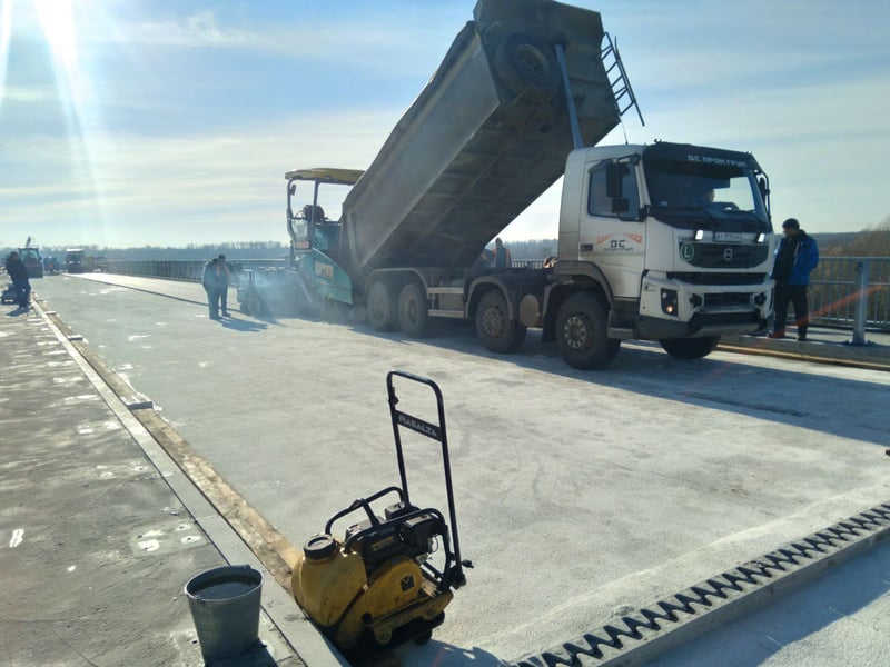 Дорожники відновлюють пошкоджений 300-метровий міст через річку Десна в Корюківському районі Чернігівської області. Уже укладають нижній шар асфальтобетону по всій протяжності штучної споруди.