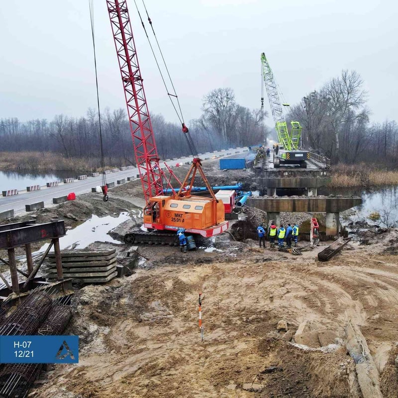 Роботи виконує підрядна організація ТОВ «ШБУ-77». Для об’їзду паралельно до наявного мосту збудовано тимчасову дорогу.