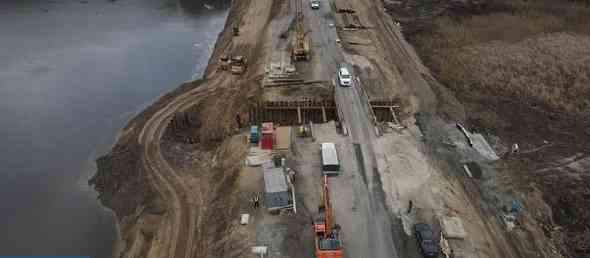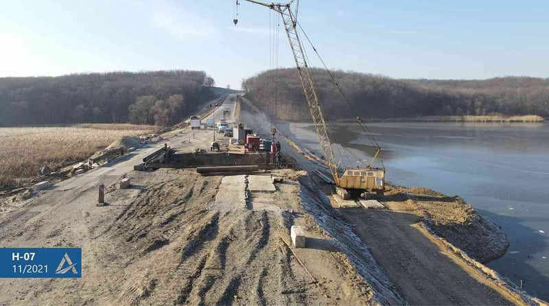 На Чернігівщині тривають роботи проводимо на одній із найскладніших ділянок траси поблизу смт Срібне. Тут дорога проходить через Тростянецьку балку зі складним рельєфом.