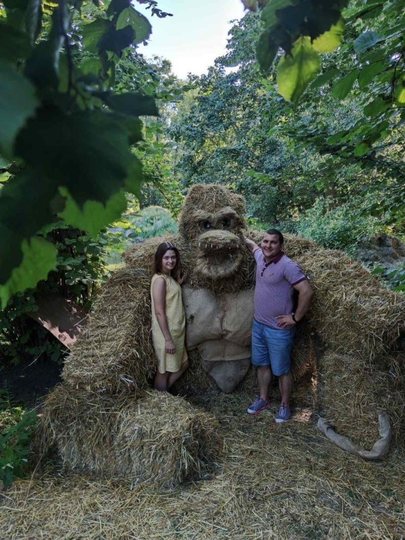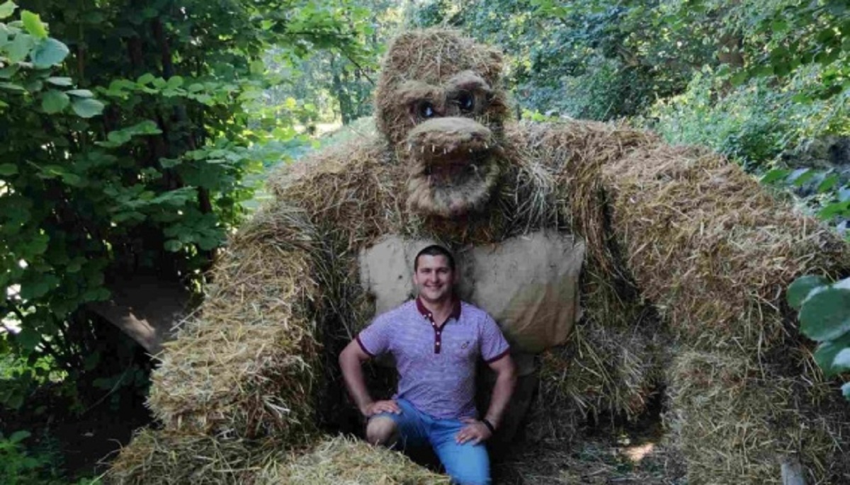 Солом’яний Кінг-Конг – перший витвір Шамрука. Збудував він його у батьківському дворі. Вигляд скульптури обрав в інтернеті, а для роботи використав підручні матеріали: солом’яні тюки, нитки, прути. Голову зробив з лляної паклі, очі – з пляшок. Висота виробу – близько 2 метрів.