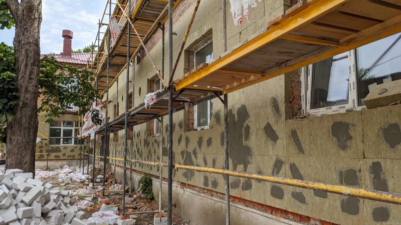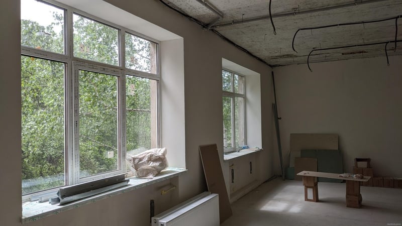 «Також повністю замінюємо все електрообладнання, підлогу, проводимо внутрішні роботи, – розповів Сергій Люшень. – Було дуже багато пластикових перегородок – усе старе, все повністю замінюється. Зараз виконуємо стяжку підлоги, шпаклівку стін, обшивку гіпсокартоном, облаштування нових санвузлів. Гіпсокартонні роботи практично завершилися, підходимо до остаточної обробки підлог, фарбування стін і облаштування стелі. Ведуться фасадні роботи, підготовка до обладнання ґанків, далі буде завершальний етап – благоустрій».