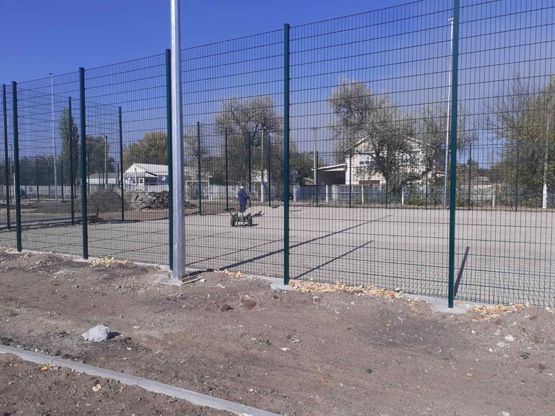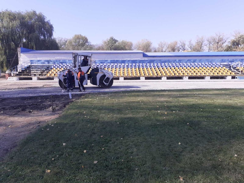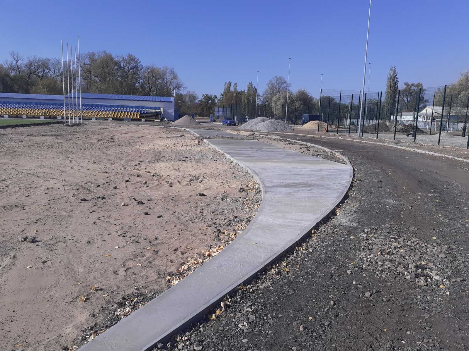 Наразі будівельники бетонують доріжки для атлетичних вправ, працюють над ущільненням гравію та вирівнюванням поверхні для асфальтування, укладають шар ґрунту під трав’яне покриття, продовжують облаштування баскетбольного майданчика.