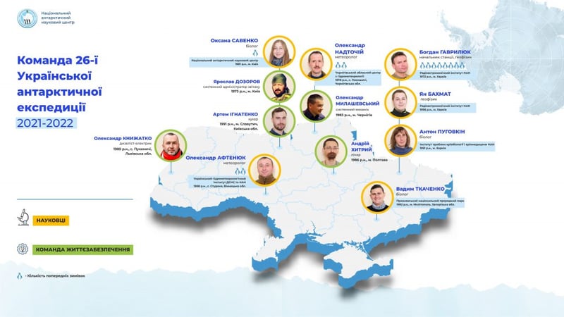 Зазначається, що її учасники проведуть на крижаному континенті близько 13 місяців. Команда знову є наймолодшою серед усіх попередніх експедицій, але очолив її один з найдосвідченіших українських полярників.