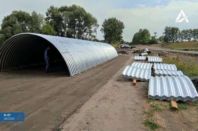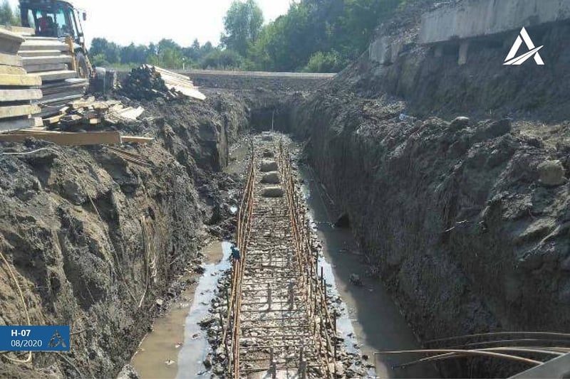 Окрім того, вже завершені роботи із влаштування свайного поля під монолітні фундаменти та розпочато підготовчі роботи для влаштування монолітних фундаментів (встановлення опалубки, армування), роботи по збірці металевої гофрованої труби.