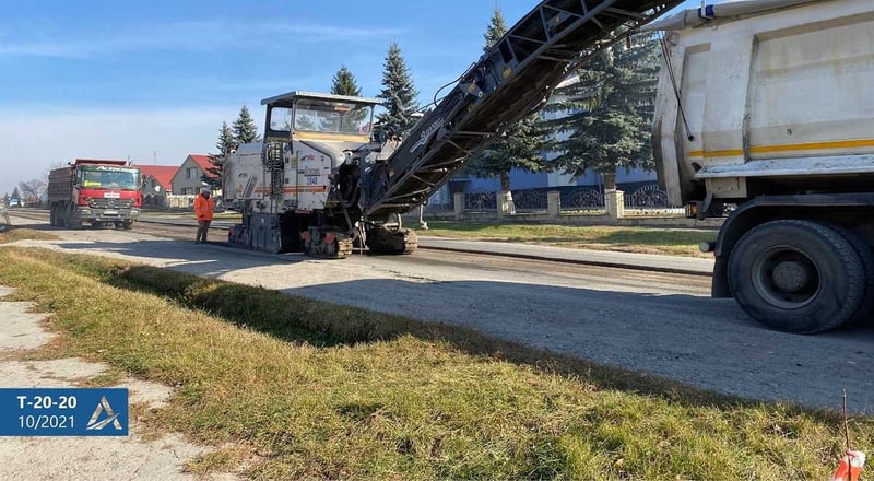 Одразу дві спецмашини проводять фрезерування старого зношеного покриття. Заплановане укріплення основи дороги, влаштування 2 шарів асфальтобетону.