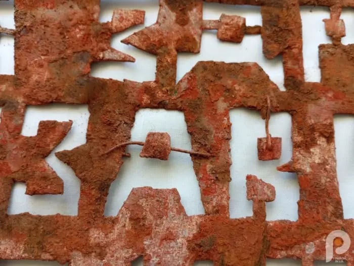 Трафарети були загорнуті в домоткане полотно або мішковину, на що вказують залишки ворсу. Фарба на лицьовій стороні схожа на саморобну ґрунтовку для металу, яка змивається водою.