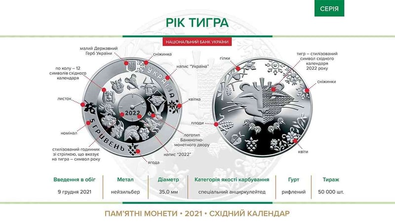 На пам’ятній монеті з одніго боку викарбують зображення тигра, який стане покровителем 2022 року, сніжинки, квіти, гілки та плоди.