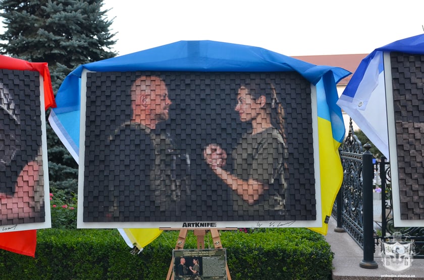 Картини створені з дерев’яних кубиків. Вони ніби «пікселі» — символ форми українських військових. Під кожною картиною розміщена табличка із QR-кодом, за яким відвідувачі можуть задонати для дитячих будинків.