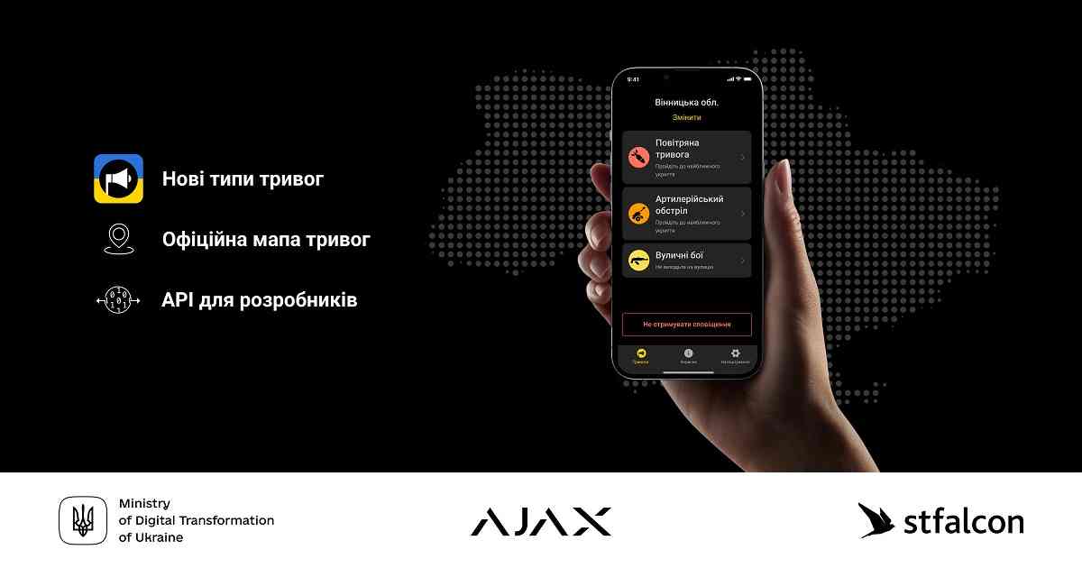 Застосунок «Повітряна тривога» розроблений Ajax Systems разом із IT-компанією stfalcon.com та за підтримки Мінцифри. Його вже завантажили майже 5 млн користувачів.