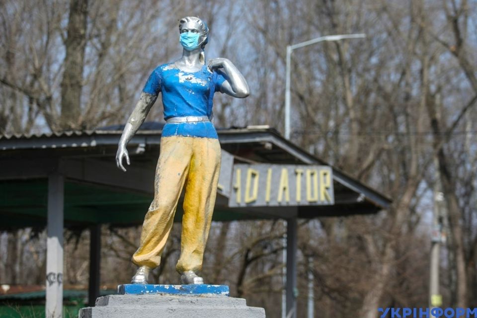У Києві пам’ятникові “Дівчина з рюкзаком”, що на Трухановому острові, “одягли” захисну маску.