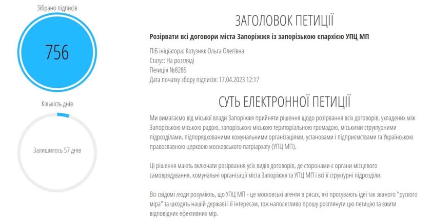 Петицію зареєструвала місцева мешканка Ольга Котузняк. За її словами, місто має розірвати всі договори, де сторонами є органи місцевого самоврядування, комунальні організації міста Запоріжжя та УПЦ МП і всі її структурні підрозділи.
