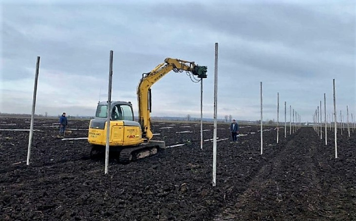 Нині в господарстві встановлюють стовпи на плантації, які зафіксують оптимальну відстань між майбутніми деревами.