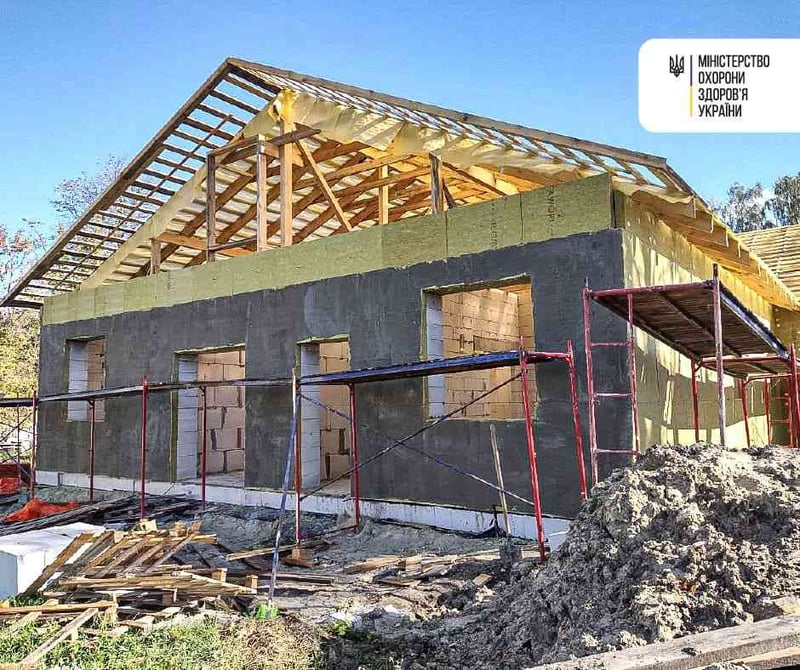 На місці зруйнованого медзакладу вже звели нову будівлю. Незабаром змонтують покрівлю та розпочнуть оздоблювальні роботи.
