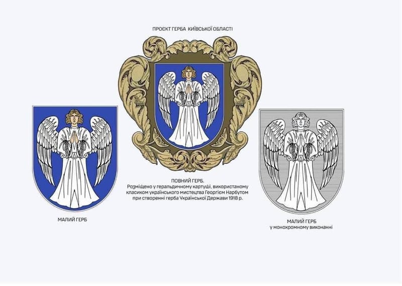 Фахівці запропонували, щоб в основі герба Київщини був зображений ангел. Варіантів прапора чотири – герб із зображенням ангела на різних кольорових фонах, серед яких: синій, білий та пурпуровий.