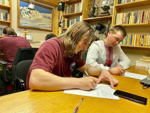 Полярники писали диктант у невеличкій спільній кімнаті української наукової станції Академік Вернадський.