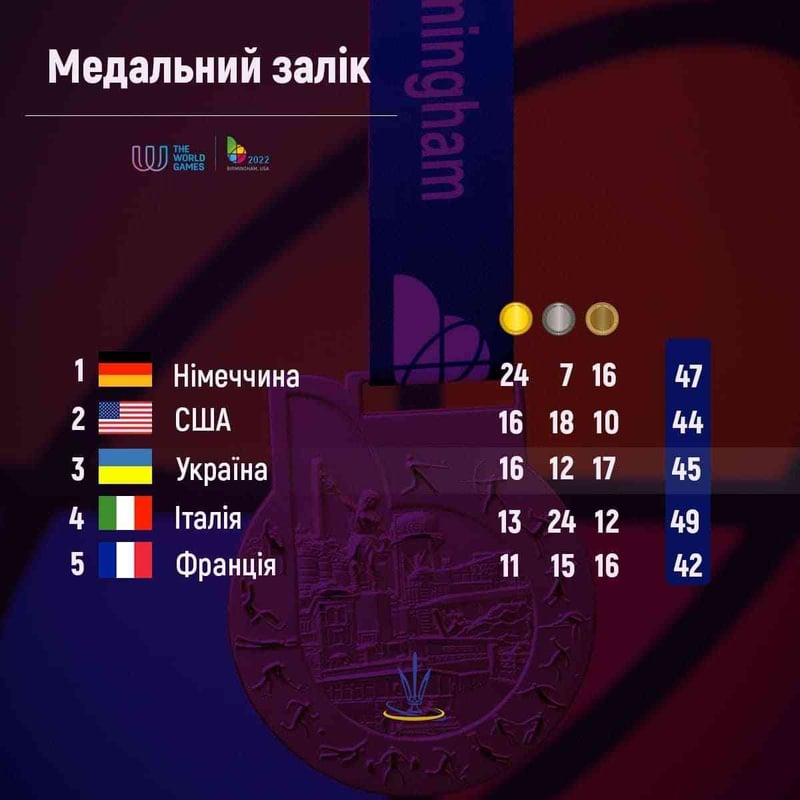 Збірна України із 45-ма медалями посіла третє місце в медальному заліку Всесвітніх ігор-2022, які завершилися в американському Бірмінгемі. Це найкращий результат за всю історію участі нашої збірної у Всесвітніх іграх.