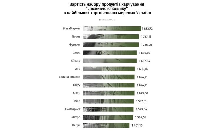 Для аналізу автори обрали 13 найбільших торговельних мереж України та впродовж тижня позначали ціни на продукти споживчого кошика у двох-трьох магазинах цих мереж. Виявилося, що найдешевше споживчий кошик на місяць обійдеться українцю в «Варусі» – у 1461,16 гривень, а найдорожче – у «Мегамаркеті» – 1832,72 гривні.