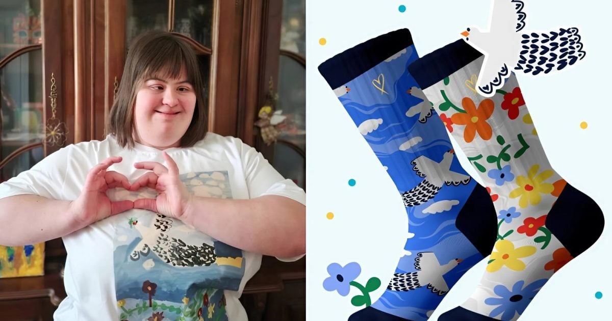 Принтом благодійних шкарпеток став малюнок 20-річної Софії Жук. Її робота «Голуб миру» перемогла у творчому конкурсі «Я, моя мрія та те, що я люблю» серед багатьох інших робіт молоді з синдромом Дауна.